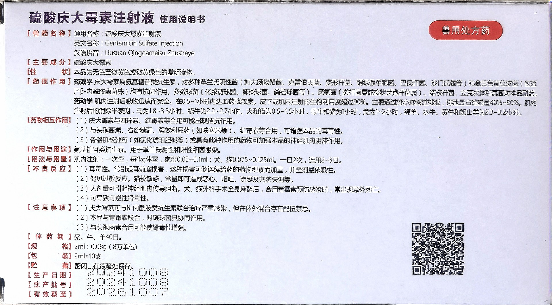 【兽药名称】通用名称:硫酸庆大霉素注射液