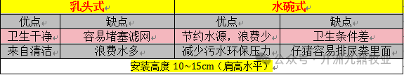 仔猪出生3天开始教会饮水,10天开始吃教槽料,饮水器选择鸭嘴式或乳头饮水碗,哺乳仔猪饮水器高度10-15cm,保证水量足够防止和脏水,水压过高安装减压阀,饮水管防止暴晒、防冻,水温控制20-25℃为宜,定期检测水质指标,定期清洗水池,并维修水管是否破损,水嘴过滤网是否被堵影响水流量。