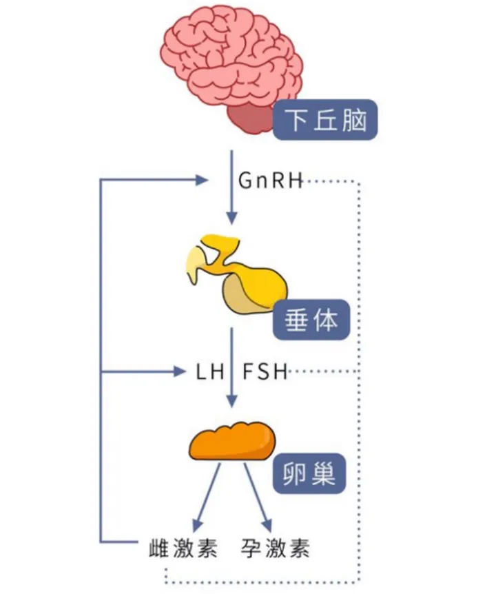 雌激素对下丘脑和垂体具有正、负反馈作用,以便调节促性腺激素的释放。当雌激素大量分泌时,一方面通过负反馈作用抑制垂体前叶分泌FSH,另一方面又通过正反馈作用,促进垂体前叶释放LH,LH的浓度会在排卵前达到最高峰,引起卵泡的破裂从而排卵。