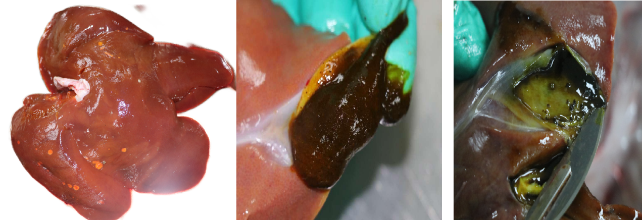 内部器官方面,肝充血、出血,有黄灰色坏死灶,胆囊黏膜坏死。脾肿大且脾髓不软化、脾间质增生,肾也出现充血出血症状,小肠的回盲结肠黏膜坏死,大肠的盲肠、结肠肠壁增厚,散在坏死区域连成大块坏死,坏死处形成灰白色溃疡,表面覆盖着坏死组织和饲料污垢。