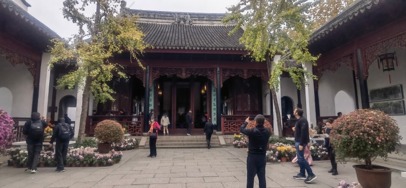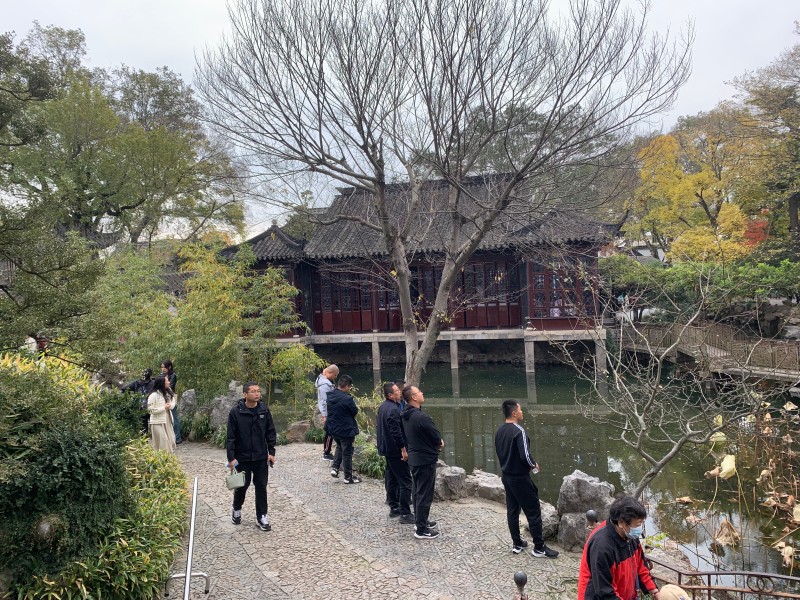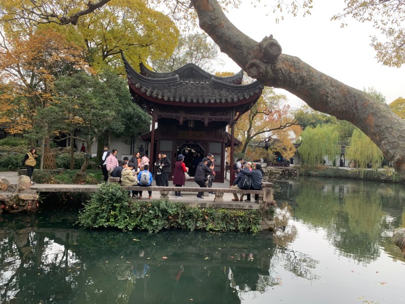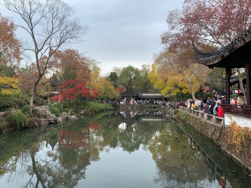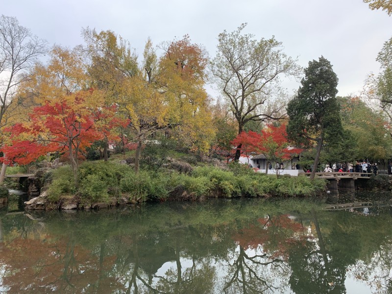 回廊起伏池曲尺,黄阁绿树水倒影。