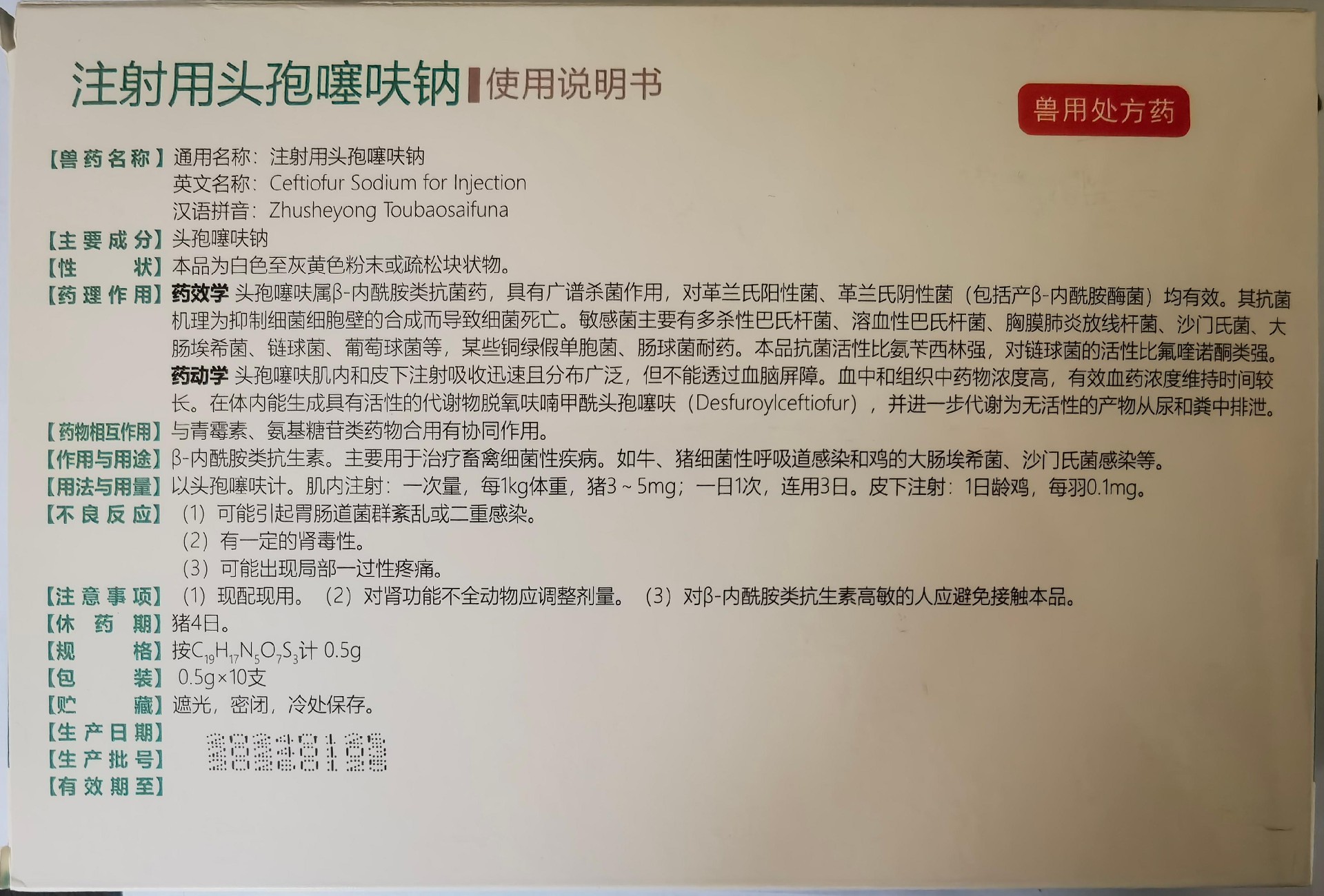 【兽药名称】通用名称:注射用头孢噻呋钠