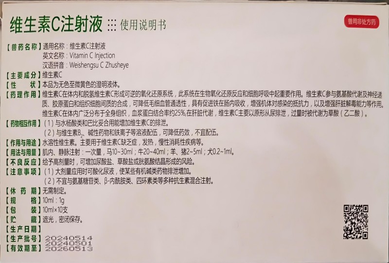 【性 状】本品为无色至微黄色的澄明液体【药理作用】维生素C在体内和脱氢维生素C形成可逆的氧化还原系统,此系统在生物氧化还原反应和细胞呼吸中起重要作用。维生素C参与氨基酸代谢及神经递质、胶原蛋白和组织细胞间质的合成,可降低毛细血管通透性,具有促进铁在肠内吸收,增强机体对感染的抵抗力,以及增强肝脏解毒能力等作用维生素C在体内广泛分布于全身组织,血浆蛋白结合率约25%,在肝脏代谢,维生素C主要以原形从尿排泄,过量时被代谢为草酸(乙二酸)【药物相互作用】(1)与水杨酸类和巴比妥合用能增加维生素C的排泄。(2)与维生素B,碱性药物和铁离子等溶液配伍,可降低药效,不宜配伍。【作用与用途】水溶性维生素。主要用于维生素C缺乏症,发热,慢性消耗性疾病等【用法与用量】肌内、静脉注射:一次量,马10~30ml;牛20-40ml;羊、猪2~5ml;犬02~1m。【不良反应】给予高剂量时,可增加尿酸盐、草酸盐或胱氨酸结晶形成的风险【注意事项】(1)大剂量应用时可酸化尿液,使某些有机碱类药物排泄增加。