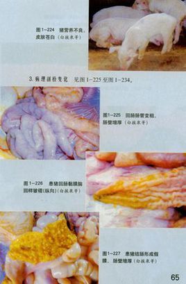 11、增生性回肠肠炎 由胞内劳森菌氏菌引起,6月龄~9月龄的育肥猪,急性的血色水样下痢;病程稍长时,排沥青样黑色粪便或血样粪便并突然死亡;后期转为黄色稀粪,也有突然死亡仅见皮肤苍白而无粪便异常的病例。慢性的间隙性下痢,粪便变软,变稀而呈糊样或水样,颜色较深,有时混有血液或坏死组织碎片;病猪消瘦。治疗:“欣米舒”加“莲矾散”加“胃肠粘膜保护剂”拌料。