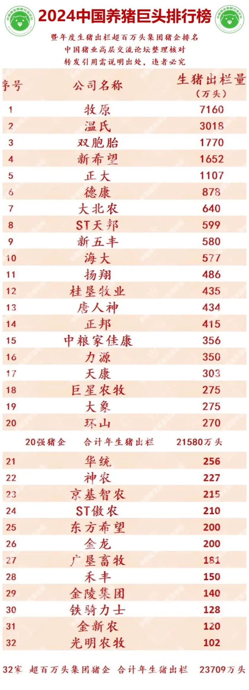 2024中国养猪巨头排行榜,32家猪企年生猪出栏2.3亿头