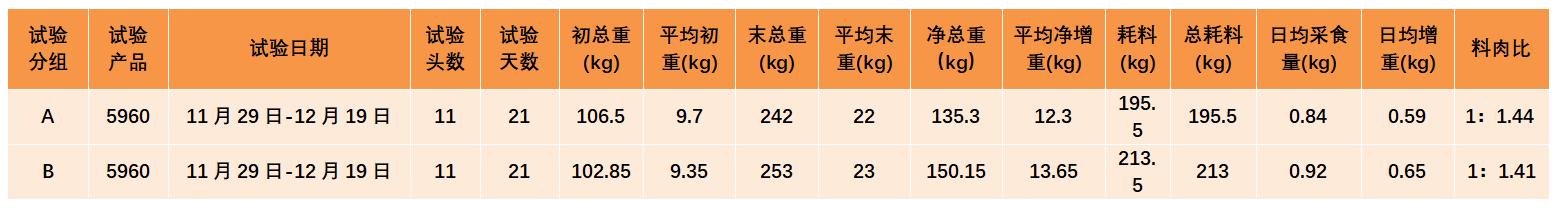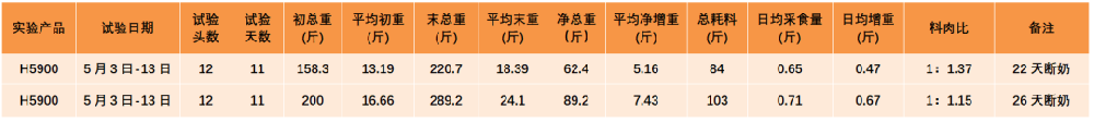 结合桂平某猪场实验数据,仔猪26天断奶8.33kg,H5900饲喂11天,日均增重335g,料肉比1:1.15。保育料5960的性能表现在教槽料结束后称重开始计算,21天的饲喂能做到日均采食量920g,日均增重650g,期间料肉比1:1.41,H5900和5960致力于使用完善、高效的肠道健康方案,保证仔猪吃得多不拉稀。