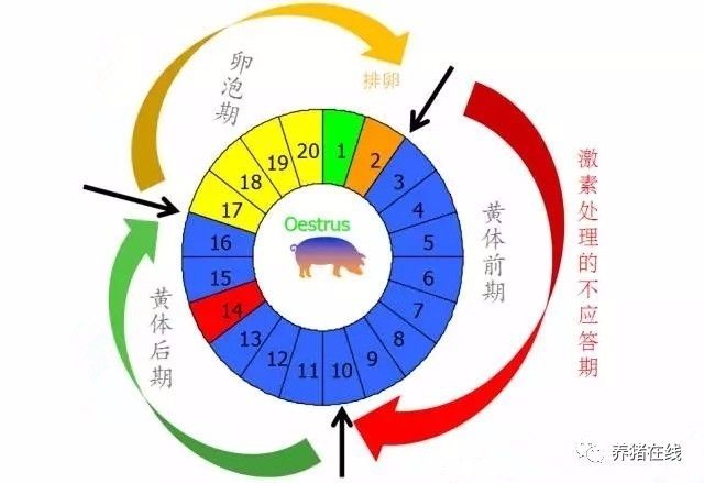 1、母猪的发情周期平均为21天(19~23天),多数经产母猪一般在仔猪断奶后的一周内(3~7天)可再次发情排卵,配种受胎。