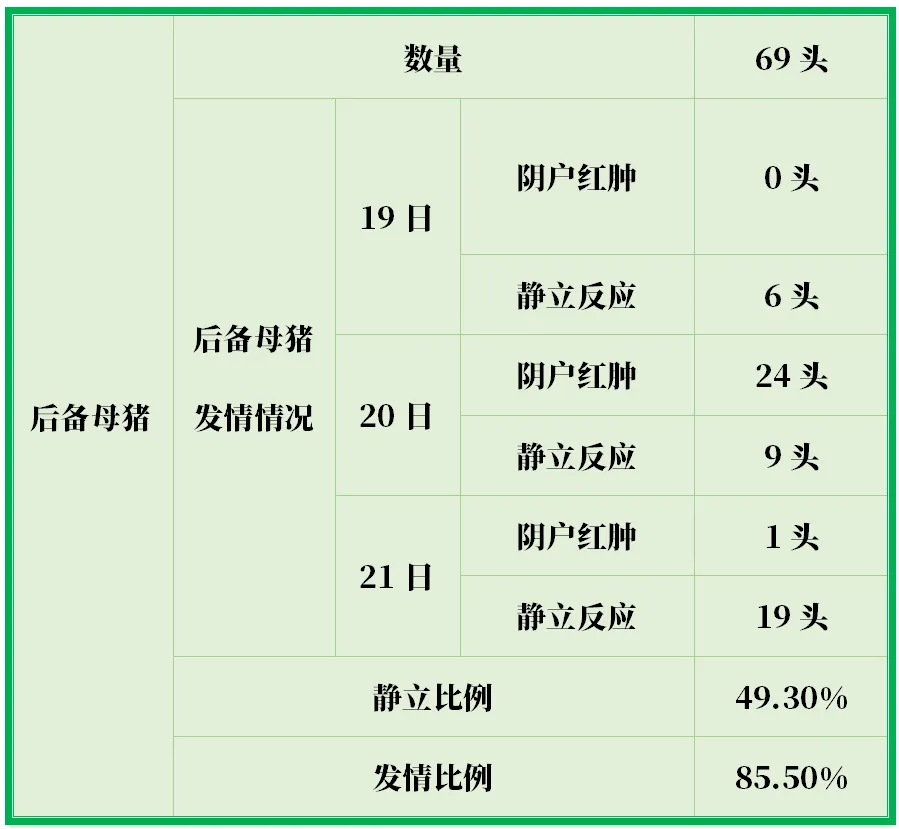3、在批次化生产模式下,后备母猪缺少初情期管理会严重影响其待配阶段的发情状态和比例。