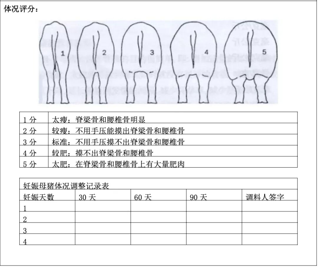 2,精准看膘投料:把“看膘投料”作为妊娠期营养管理的核心要诀,将体况评分(BCS)5分制图悬挂在猪舍显眼位置,定期组织饲养员培训与实操演练,使其熟练掌握视觉观察与触摸相结合的体况评估技巧,依母猪胖瘦精准调控饲料投喂量,满足胎儿发育需求的同时,防止母猪过肥或过瘦。