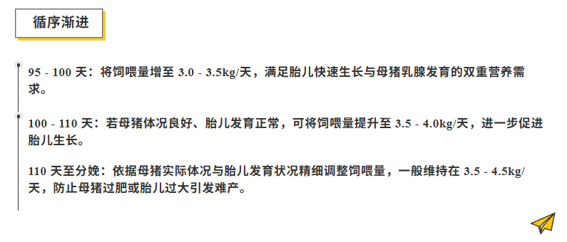 【目标】:满足胎儿快速增重期的营养需求,提高仔猪出生体重和均匀度,同时避免母猪过肥影响分娩。