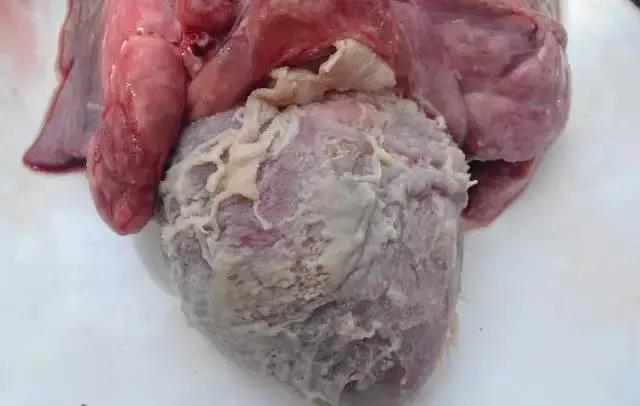 病理变化:初期心包积液、胸水、腹水和关节液增加,继而在胸腔、腹腔和关节等部位出现淡黄色的纤维素性渗出物,严重病例发现心包与心脏、肺与胸膜黏连