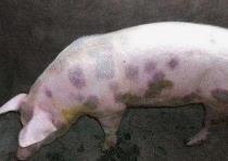 在站立时,四肢紧靠,头下垂,背弓起。减食或食欲废绝。大猪和老龄猪粪便干硬,而小猪表现腹泻。皮肤呈凸起的红色区域,红斑大小不一,多见于耳后、颈下、背、胸腹下部及四肢内侧,后瘀血发紫。