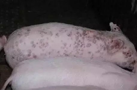 基本不影响吃喝,主要在病猪耳部、背部、腹部、前肢、后腿、臀部等部位广泛性出现各种大小不一的红斑、斑点、丘疹,圆形或不规则的隆起,呈现红色或紫色,中央为黑色的病灶,持续时间长,指压不褪色。保育猪和生长猪多发,病猪可见腹股沟淋巴结明显肿大。