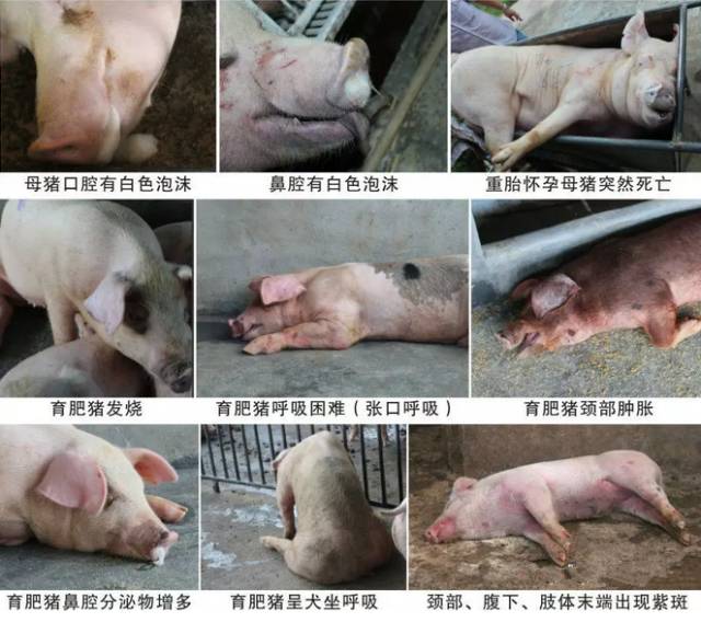 猪肺疫(锁喉风、肿脖瘟)口鼻有白色泡沫、有的留浓鼻子、犬坐、呼吸高度困难、颈部皮肤红肿,触摸有疼痛感、尖叫。皮肤上可见淤血性血斑。猪肺疫死亡鼻子流出白色泡沫,个别带血。剖检肺脏水肿、气肿、颌下皮肤有胶冻样浸润。治疗首选恩诺沙星、氟苯尼考。