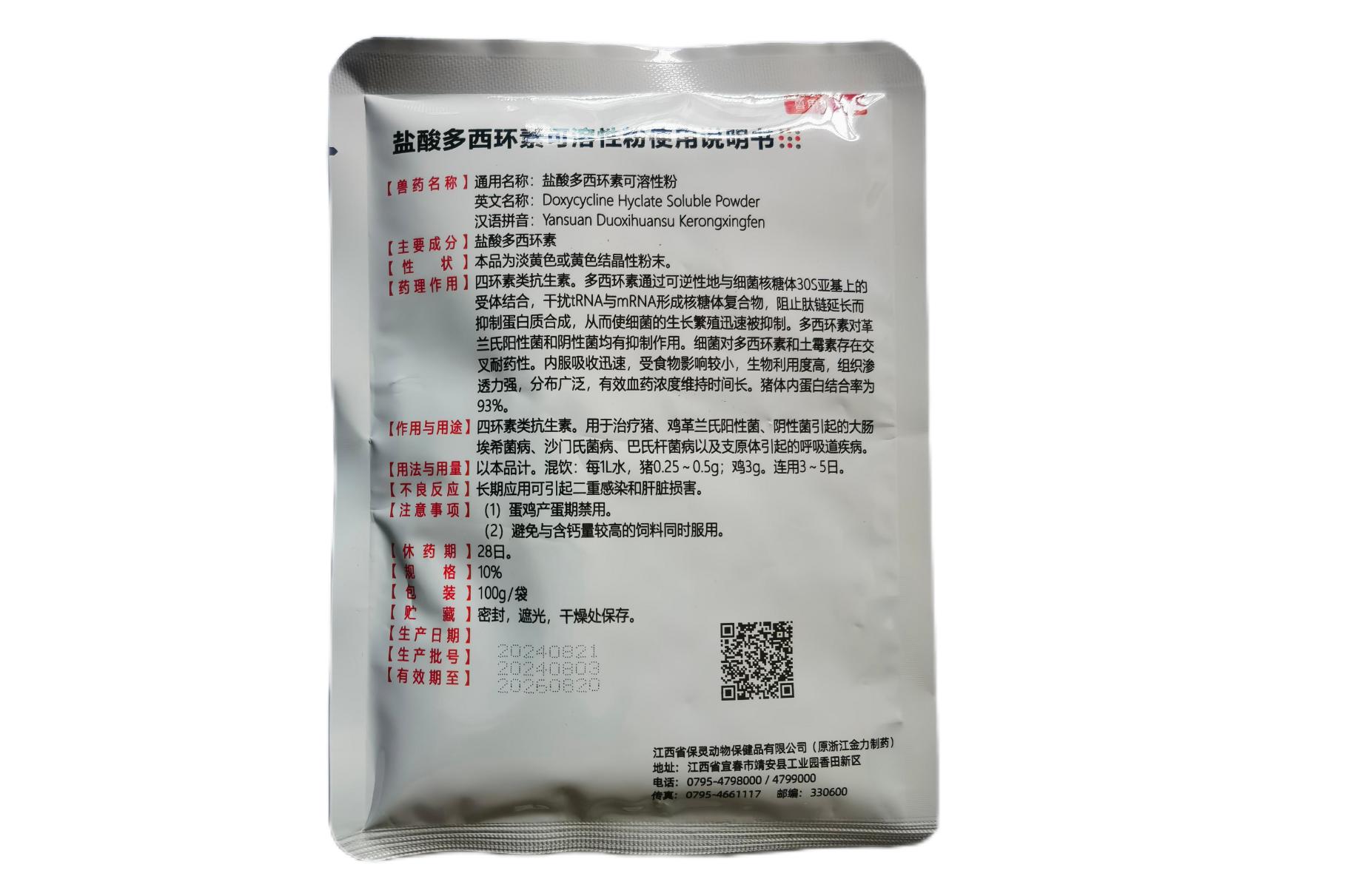 【作用与用途】四环素类抗生素。用于治疗猪、鸡革兰氏阳性菌、阴性菌引起的大肠埃希菌病、沙门氏菌病、巴氏杆菌病以及支原体引起的呼吸道疾病。