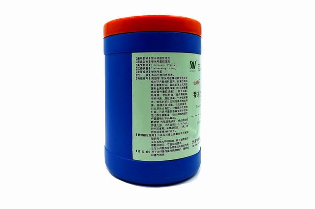 【通用名称】替米考星预混剂 【商品名称】替米考星预混剂 【英文名称】Tilmicosin Premix 【汉语拼音】Timikaoxing Yuhunji 【主要成分】替米考星 【性 状】本品为类白色粉末。 【药理作用】药效学 替米考星属动物专用半合成大环内酯类抗菌药,抗菌作用与泰乐菌素相似,敏感的革兰氏阳性菌有金黄色葡萄球菌(包括耐青霉素金黄色葡萄球菌)、肺炎球菌、链球菌、炭疽杆菌、猪丹毒杆菌、李斯特菌、腐败梭菌、气肿疽梭菌等。敏感的革兰氏阴性菌有嗜血杆菌、脑膜炎双球菌、巴氏杆菌等,对支原体也有效。对胸膜肺炎放线杆菌、巴氏杆菌及畜禽支原体的活性比泰乐菌素强。95%的溶血性巴氏杆菌菌株对本品敏感。 药动学 内服后吸收快,特点是组织穿透力强,分布容积大(>2L/kg)。肺中浓度高,半衰期可达1~2天,有效血浓度维持时间长。 【药物相互作用】⑴本品与肾上腺素合用可增加猪的死亡。 ⑵与其他大环内酯类、林可胺类因作用靶点相同,不宜同时使用。 ⑶与β-内酰胺类合用表现为拮抗作用。 【适 应 症】用于治疗猪传染性胸膜肺炎、猪肺疫和猪气喘病。 【用法用量】以本品计。混饲:每1000kg饲料,猪2000~4000g。连用15日。 【不良反应】⑴本品对动物的毒性作用主要是心血管系统,可引起心动过速和收缩力减弱。 ⑵许多动物内服后常出现剂量依赖性胃肠道紊乱(如呕吐、腹泻、肠疼痛等),这可能由对平滑肌的刺激作用引起。 【注意事项】仅用于治疗。替米考星对眼睛有刺激性,可引起过敏反应,避免直接接触。 【休 药 期】猪14日。 【规 格】10% 【包 装】100g/袋 【贮 藏】遮光,密闭保存。 |