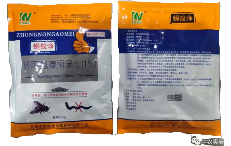 【通用名称】环丙氨嗪预混剂(1%) 【性状】本品为白色粉末。 【主要成分】环丙氨嗪 【药理作用】环丙氨嗪属于杀虫药,可抑制双翅目幼虫的蜕皮,特别是第1期幼虫蜕皮,使蝇蛆繁殖受阻,也可使蝇呦不能蜕皮而死亡。鸡内服给药,即使在粪便中含药量极低也可彻底杀灭蝇蛆。当饲料中浓度达1mg/kg时即能控制粪便中多数蝇蛆的发育,5mg/kg时,足以控制各种蝇蛆。一般在用药后6~24小时发挥药效,作用可持续1~3周。鸡内服本品后吸收较少,其体内主要代谢物为三聚氰胺。主要以原形从粪便排出。由于环丙氨嗪脂溶性低,很少在组织中残留。对动物的生长、产蛋及繁殖性能均无影响。 【作用与用途】杀蝇药。用于控制动物厩舍内蝇幼虫的繁殖。 【规格】1% 【用法与用量】以本品计。混饲 :每1000kg饲料,鸡500g。连用4~6周。 【包装】500g/袋×35袋/箱