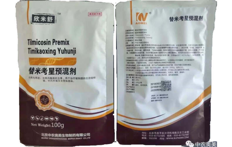 【通用名称】替米考星预混剂 【主要成分】替米考星 本品为类白色粉末。 【药理作用】药效学 替米考星属动物专用半合成大环内酯类抗菌药,抗菌作用与泰乐菌素相似,敏感的革兰氏阳性菌有金黄色葡萄球菌(包括耐青霉素金黄色葡萄球菌)、肺炎球菌、链球菌、炭疽杆菌、猪丹毒杆菌、李斯特菌、腐败梭菌、气肿疽梭菌等。敏感的革兰氏阴性菌有嗜血杆菌、脑膜炎双球菌、巴氏杆菌等,对支原体也有效。对胸膜肺炎放线杆菌、巴氏杆菌及畜禽支原体的活性比泰乐菌素强。95%的溶血性巴氏杆菌菌株对本品敏感。 药动学 内服后吸收快,特点是组织穿透力强,分布容积大(>2L/kg)。肺中浓度高,半衰期可达1~2天,有效血浓度维持时间长。 【适应症】用于治疗猪传染性胸膜肺炎、猪肺疫和猪气喘病。 【规格】20% 【用法用量】以本品计。混饲:每1000kg饲料,猪1000~2000g。连用15日。 【包装】(100g×10)/袋×10袋/箱