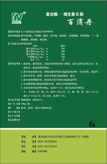 【原料组成】维生素B族、牛磺酸,载体:蛋白酶、淀粉酶、木聚糖酶、纤维素酶、β—葡聚糖酶、果胶酶、稻壳粉。
