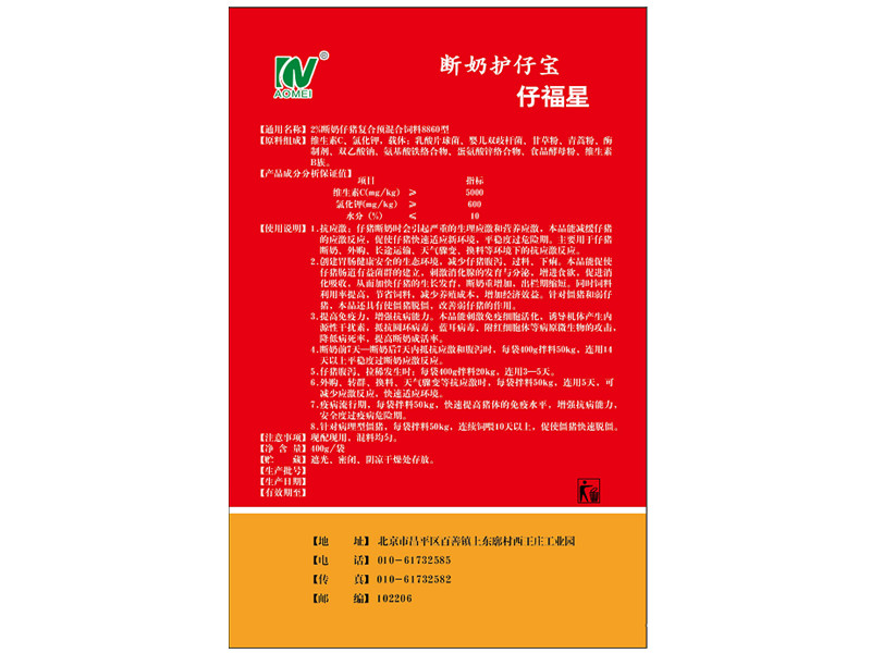 4.断奶前7天—断奶后7天内抵抗应激和腹泻时,每袋400g拌料50kg,连用14天以上平稳度过断奶应激反应。