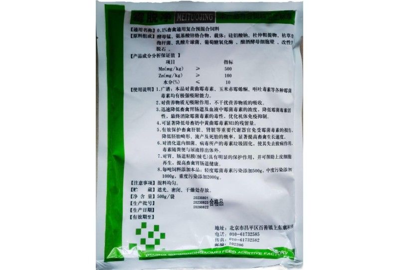 8.每吨饲料添加本品:轻度霉菌毒素污染添加500g,中度污染添加1000g,重度污染添加2000g。