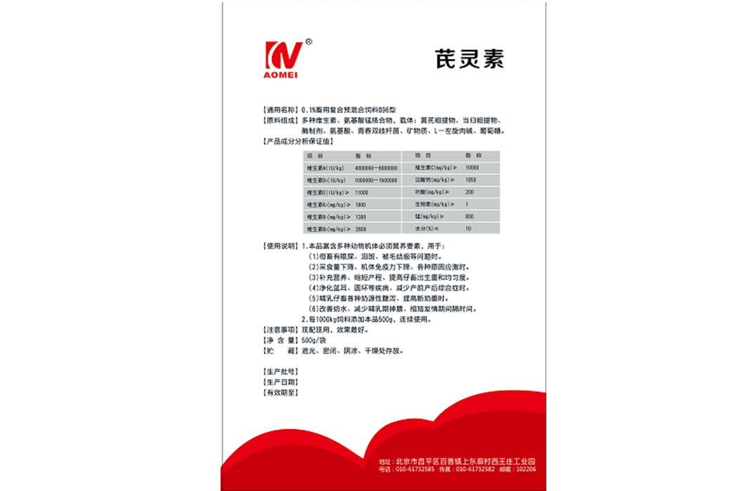 | 维生素E(IU/kg) | ≥11000 | 叶酸(mg/kg) | ≥200 |