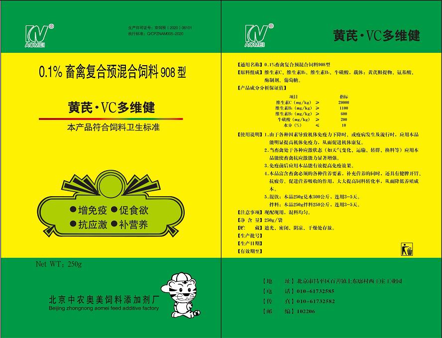 【通用名称】0.1%畜禽复合预混合饲料908型【原料组成】维生素C、维生素B1、维生素B2、牛磺酸,载体:黄芪粗提物、氨基酸、酶制剂、葡萄糖。【产品成分分析保证值】项目指标···
