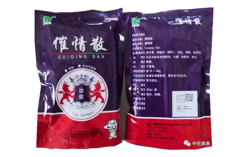 催情散【主要成分】淫羊藿、阳起石(酒淬)、当归、香附、益母草等。【功能】催情。【主治】不发情。【用法与用量】猪30~60g。【包装规格】300g/袋×50袋/箱